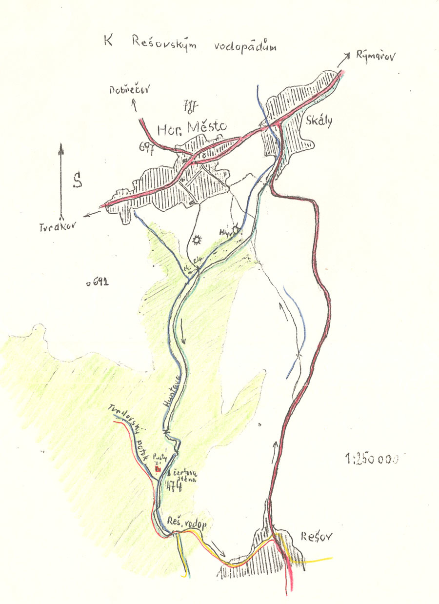 Z Rešova jdeme do Horního Města po silnici nebo asi po 1,5 km odbočíme vlevo a jdeme po polní cestě až do Horního Města. Orientujeme se snadno, protože cíl vidíme před sebou.Tento výlet můžete zvolit i opačně - tedy dojedete nebo dojdete do Rešova a po značkách směrem k Rešovským vodopádům. Tato cesta není tak náročná jako od Horního Města.Celkem ujdeme asi 10 - 11 km.