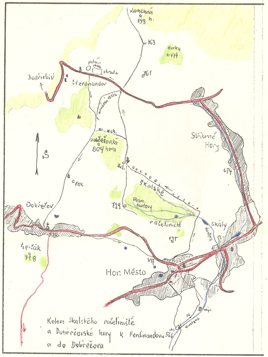 b) Pokračujeme po polní cestě až k silnici Stříbrné Hory - Bedřichov, kterou vidíme před sebou. Nacházíme se v území zaniklé osady Ferdinandov, která byla ještě do padesátých let částečně obydlená. Vlevo po silnici dojdeme k nově zrekonstruované kapličce.
